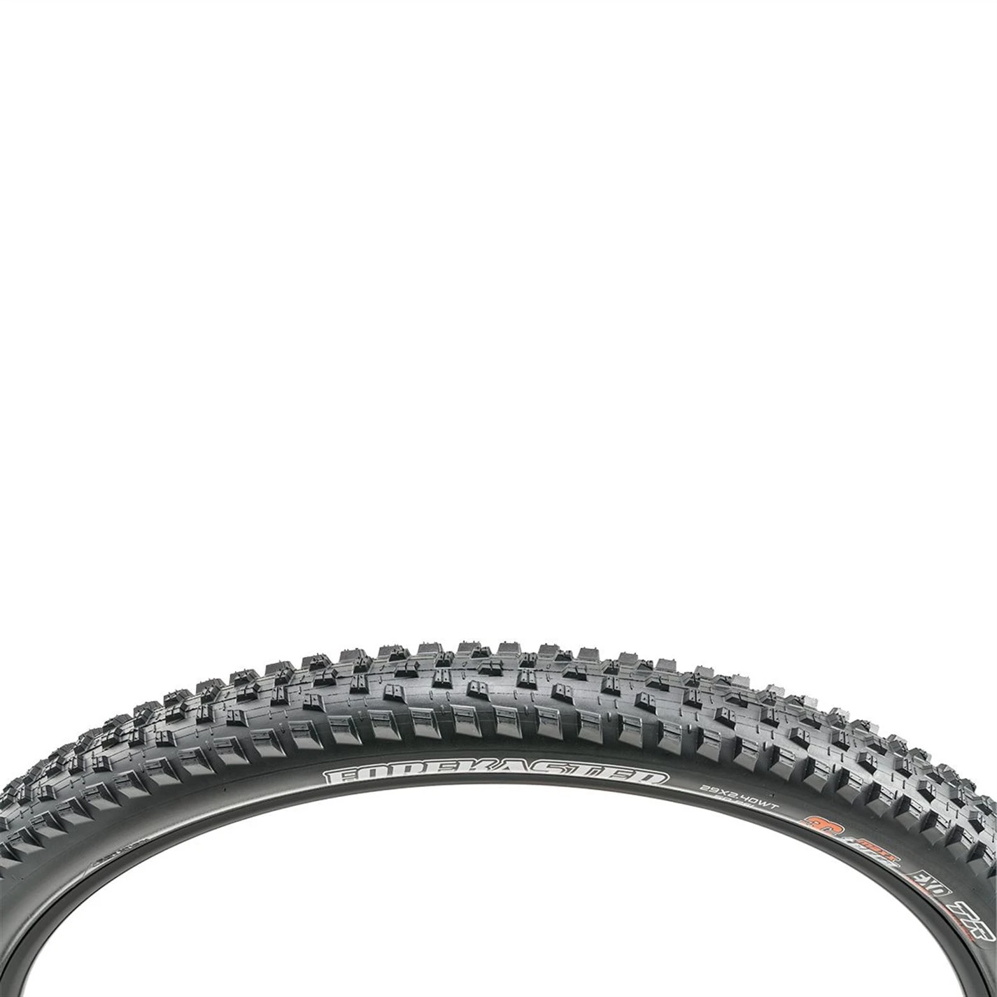 > A densely packed tread pattern to increase rolling efficiency > Taller side knobs to improve cornering grip > Raised ridges on the casing to promote mud clearing > Increased casing width and volume from 2.35 to 2.40 and 2.60 > Two rubber compound options: Dual or 3C MaxxTerra > EXO sidewall protection > Tubeless ready casings