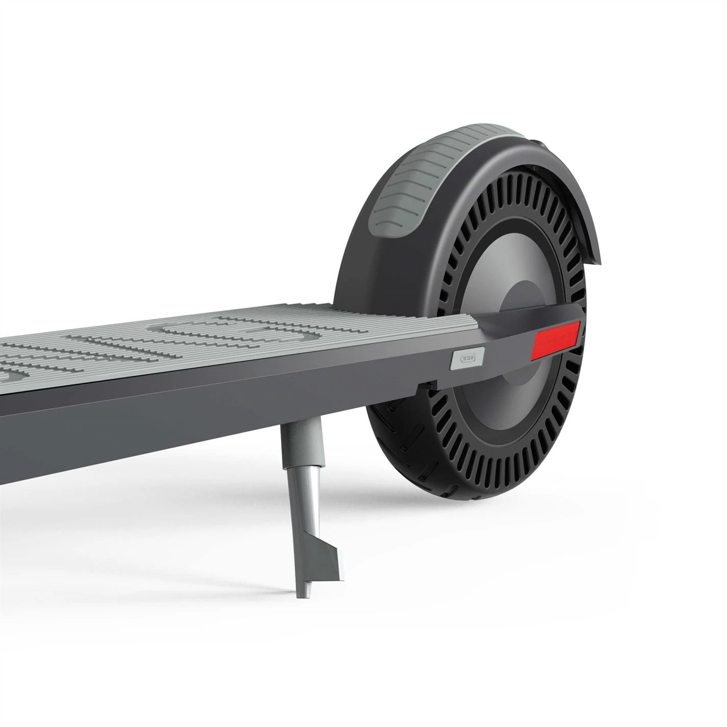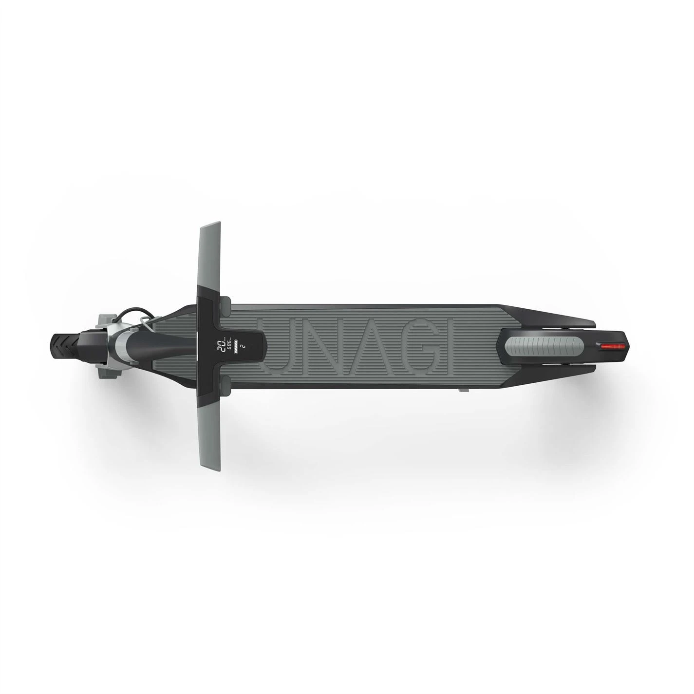 Integrated in the top bar are the intuitive controls of the dashboard—throttle, brake, horn, and LED headlight. No visible wires. No bulky console. Just a sleek, integrated command center that connects the rider to the ride. By combining a singular piece of machined aluminum with embedded silicon on the top surface for traction, the scooter deck achieves an ideal combination of rigidity and comfort.