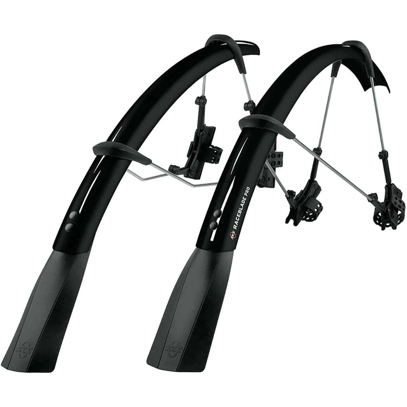 The SKS Raceblade PRO is the ultimate clip-on mudguard pair for road bikes on the market. The Raceblade set has been designed to fit as close to your tyres as possible to minimise the amount of spray coming from your tyres. The guards can work alongside tyres of 25mm or lower. The smart, double hinged quick release fitting system also fits aero forks and is compatible with disc brakes. The Raceblade PRO’s can be perfectly adjusted to the radius of the wheel by maniupulating the length of the stays. The superlight and extra long mud flaps help to catch the additional spray coming from your wheels. The guards are supplied with adhesive protective pads that stop the guards from damaging your paintwork.
