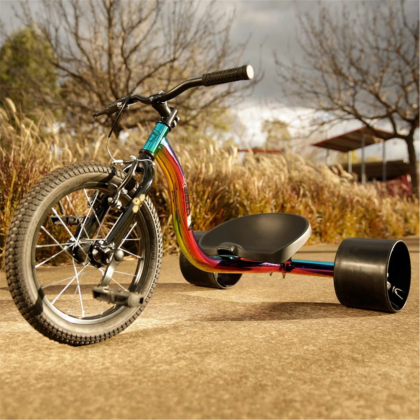 The junior drift trike has extra durable rear slick drifting wheels that are designed to get sideways! The 18 front wheel and adjustable seat position keeps the trike versatile and easy for smaller riders to get up to speed!