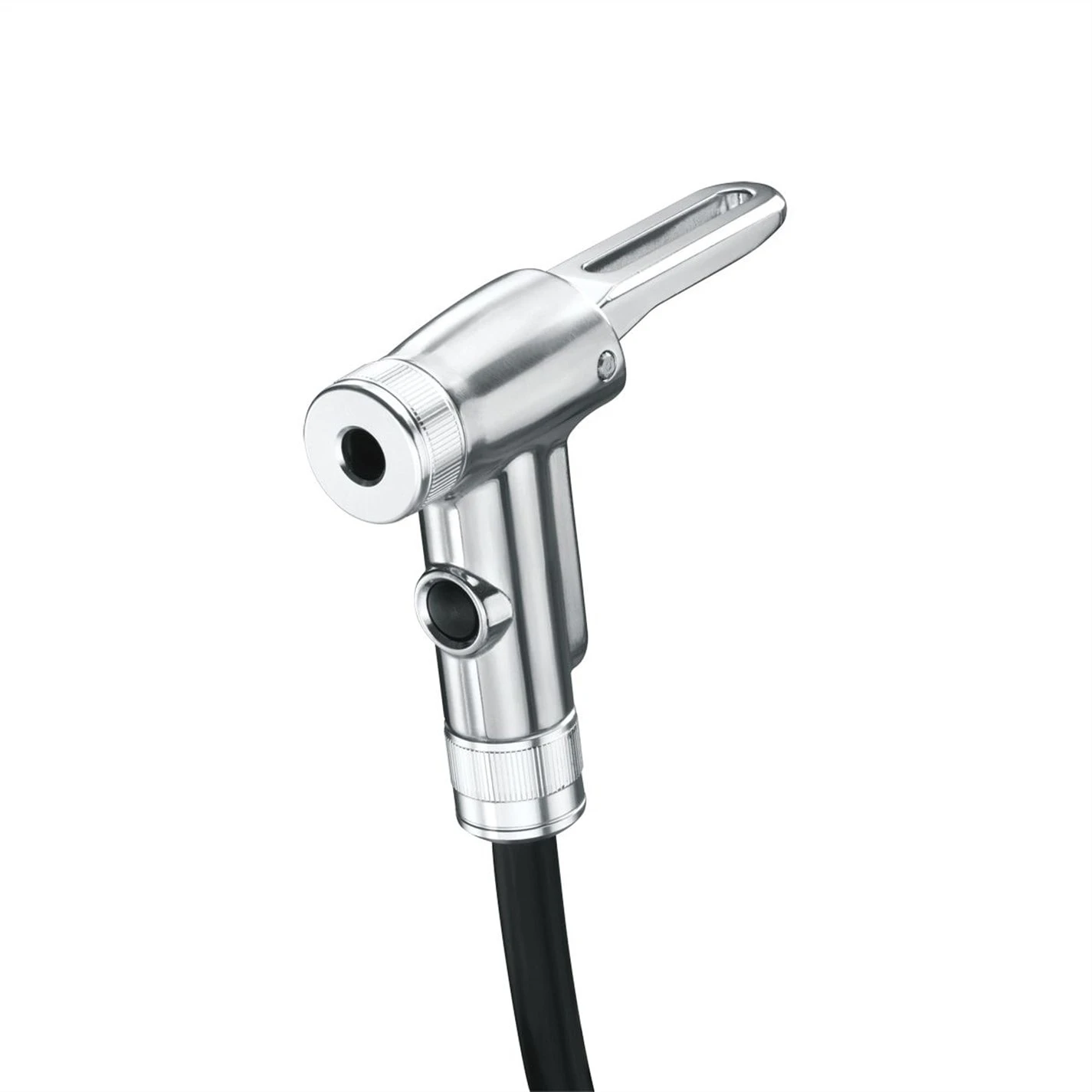 > Anodised aluminium barrel > Oversized padded handle > Stable aluminium and rubber base > SmartHead(TM) DX1 head > Extra long hose > Air bleed button for precise pressure setting > Head ‘dock’ holds hose > Easily inflates up to 200psi > Includes ball, air bladder needles