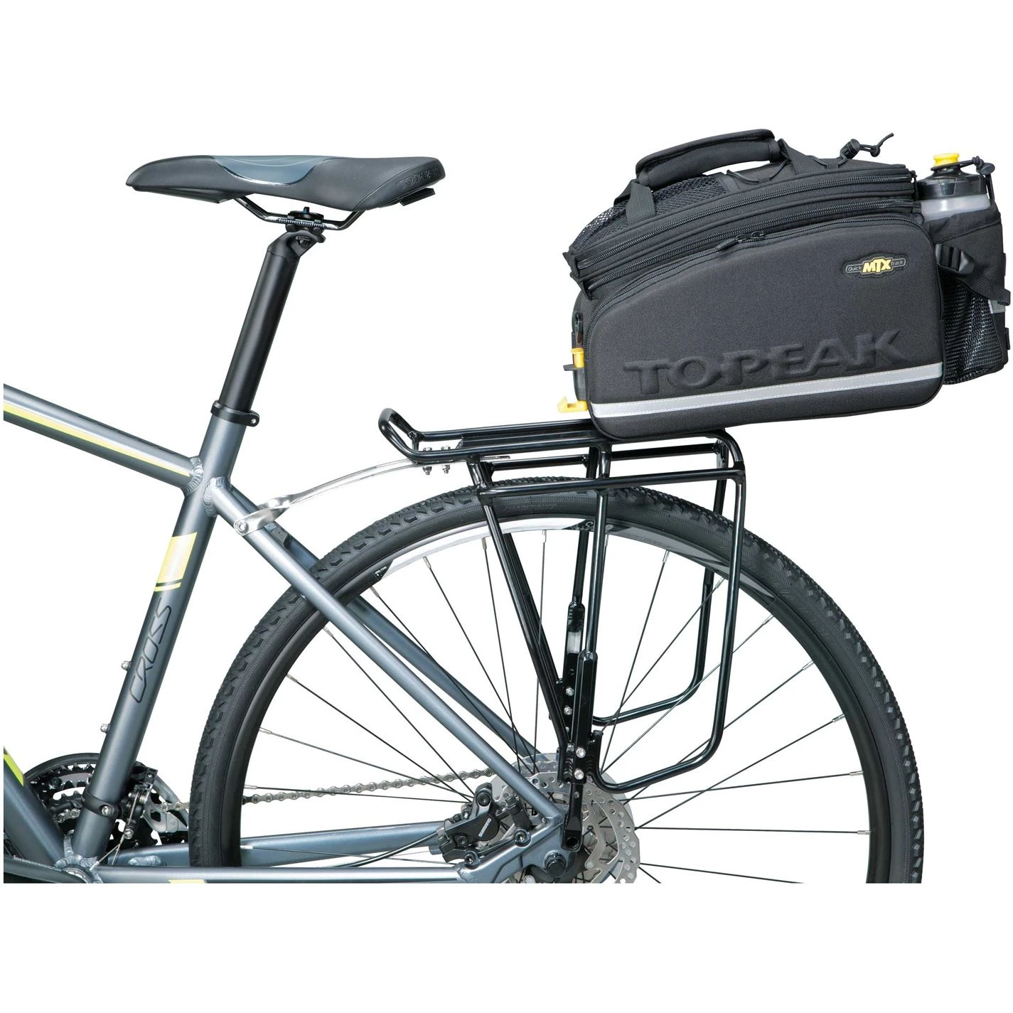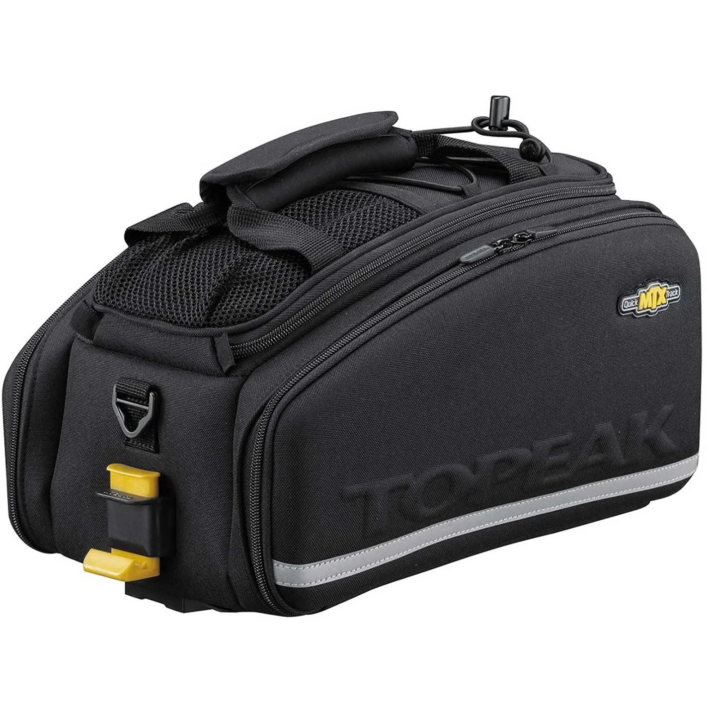 The Topeak MTX Trunk EXP Bag with Pannier is a super large all-in-one pannier trunk bag. The large capacity MTX Trunkbag contains one main divided compartment with two expandable side panels. These side panels can be rolled up and zipped away when they are not in use. The unique construction process of the bag provides rigidity and water repellency to cope with the British weather. The bag is compatible with all MTX QuickTrack racks with attached side frames.