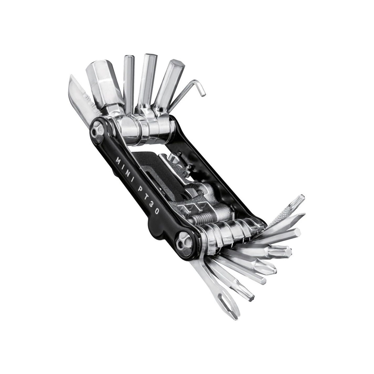 > 2, 2.5, 3, 4, 5, 6, 8mm Allen keys > 10mm allen socket > T10, T15, T25 Torx wrenches > Spoke wrenches (15g/14g/Mavic M7/ > Shimano 4.5mm) > Hard-anodised tyre lever > Chain hook > Chain tool > Power link tool > Phillips & flathead screwdrivers > Bottle opener with spoke holder > Disc spacer > Serrated knife/saw > Neoprene bag > 169g (Mini PT30 tool) > 40g (ToolBox)