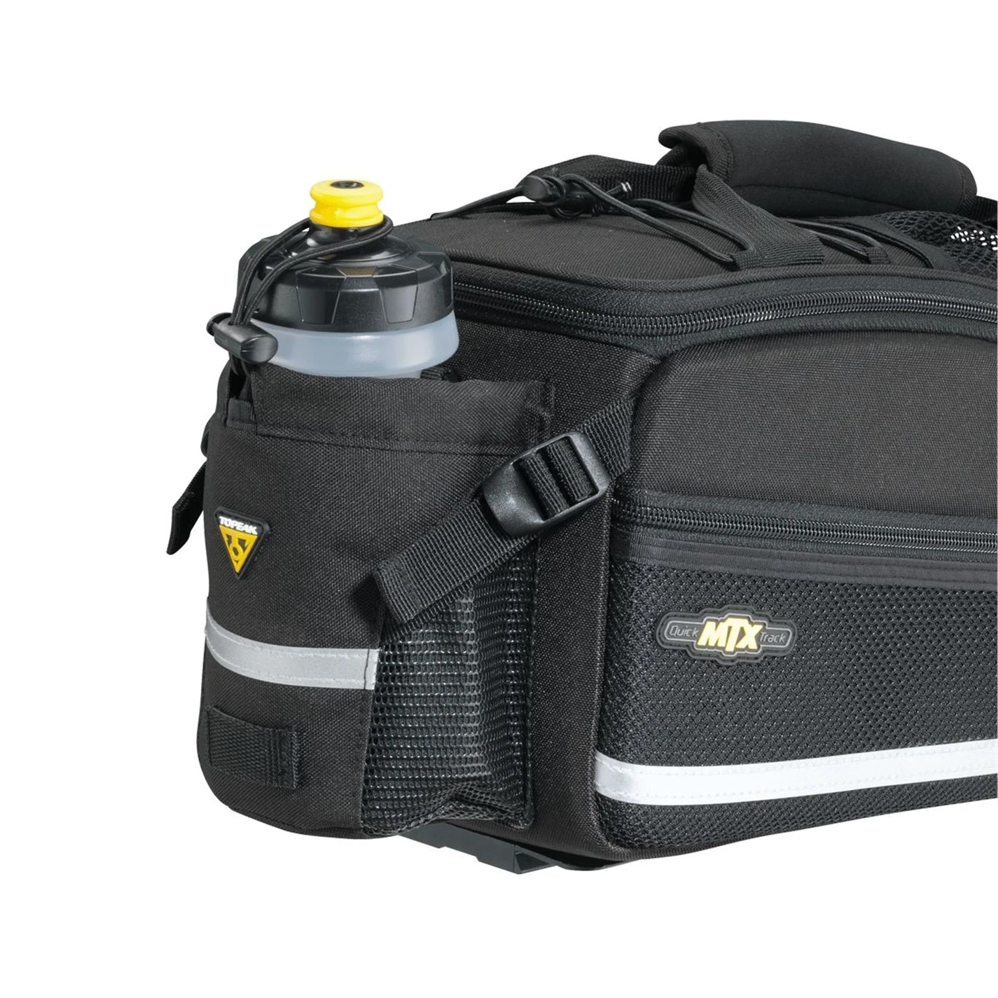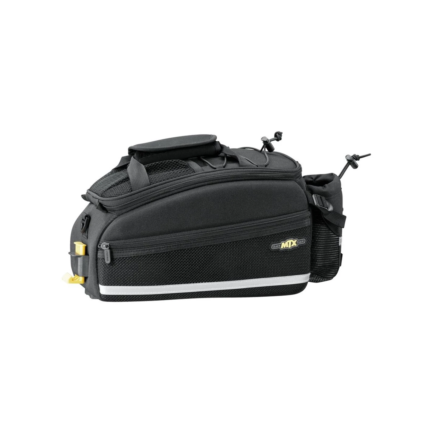 The Topeak Trunk Bag MTX EX is a handy trunk bag if are to own a topeak MTX Pannier rack, great for trips away or just for the daily commute, where you need that extra added protection. The MTX QuickTrack compatible TrunkBag, features a divided main compartment, which is constructed with our unique process of combining rigid panels and flexible fabric for structure and water repellence. In addition, it also features two mesh side compartments for extra capacity and rear water bottle holder lets you carry more water on extended trips.