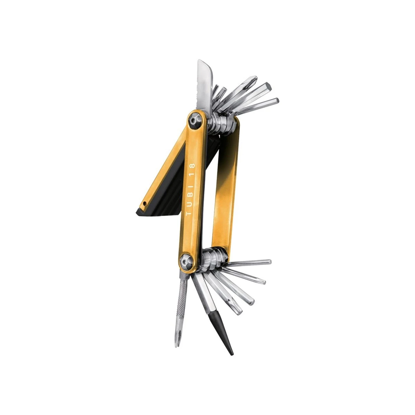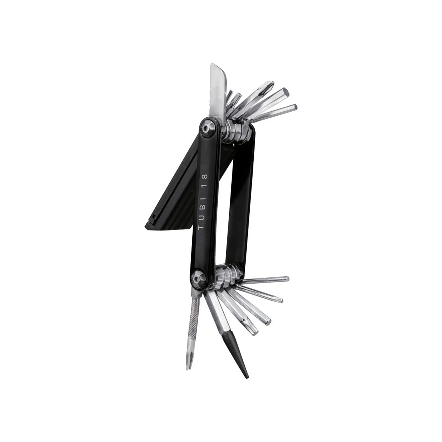 > 2, 2.5, 3, 4, 5, 6mm Allen keys > T10/T25 torx wrench > Phillips screwdriver > Stainless steel reamer > Plug tool > Air-stop with cover > Serrated knife/saw > 3x 3,5mm thick repair plugs > Repair plug compartment > 7.6×4.1×1.8cm > 119g